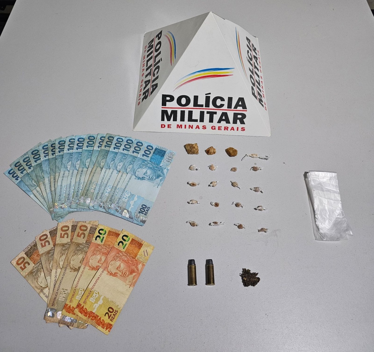 Durante as buscas foram localizadas 20 pedras de crack, 02 munições calibre 44, 01 telefone celular e R$1.840,00.